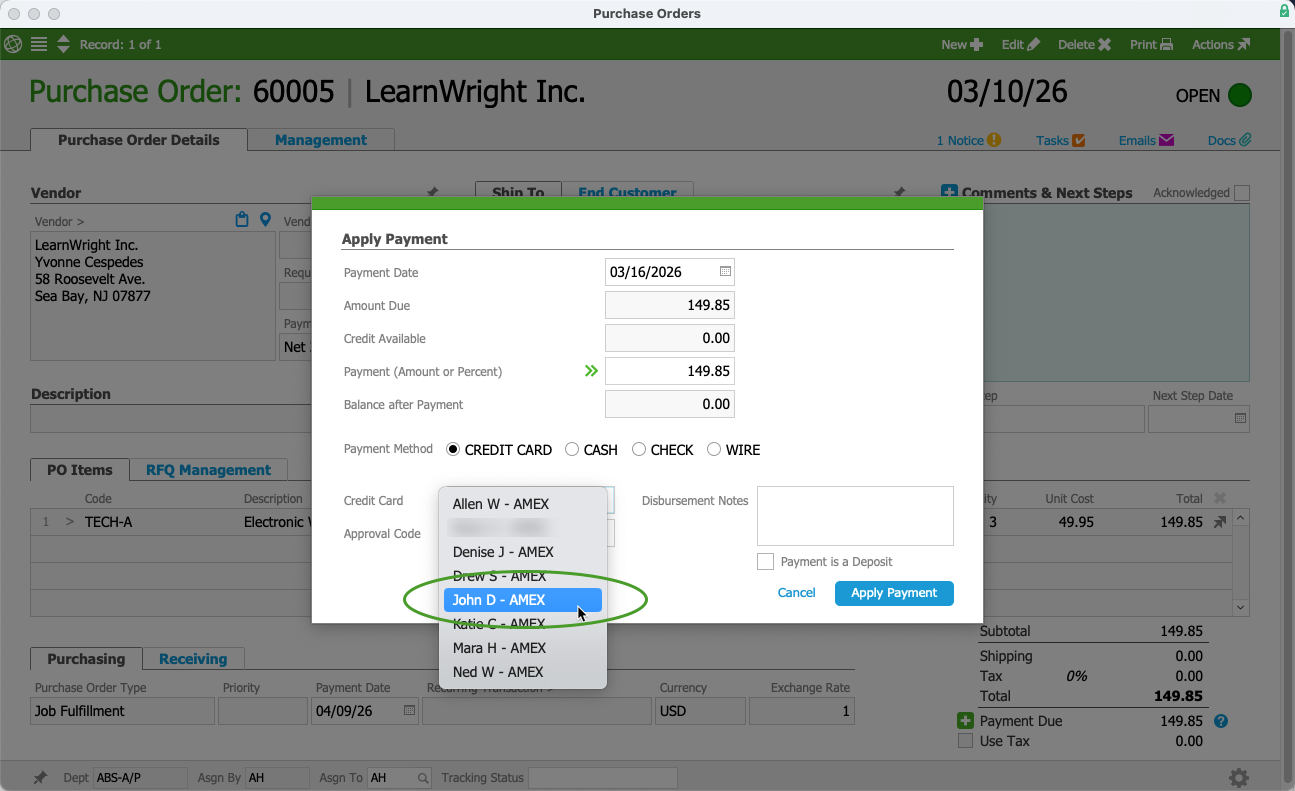 The credit card will be available in the credit card dropdown list for payment dialogs in various modules.