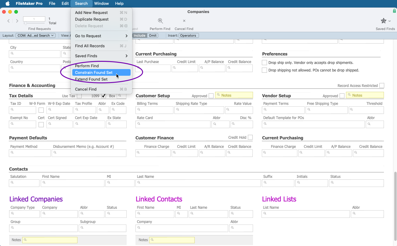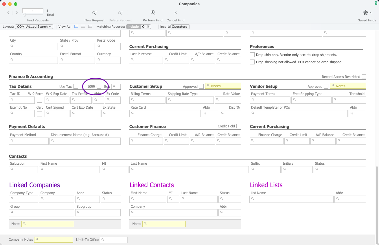 This search does not itself limit your list to companies flagged as 1099. You might need to further constrain the list to display only 1099 companies using Advanced Search by entering the Advanced Search details, then selecting the FileMaker Search > Constrain Found Set.
