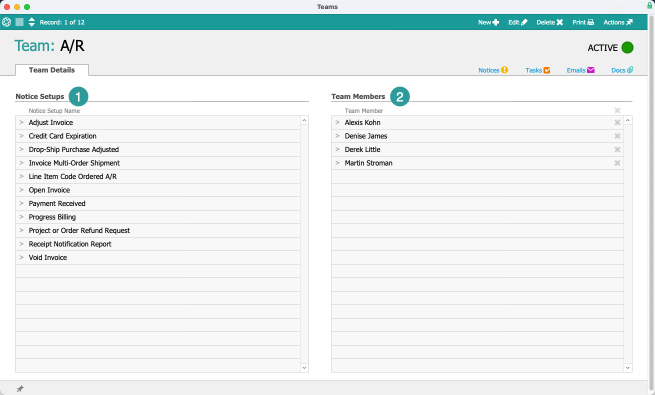 You can create notice setups and specify an entire team as the recipient. Any notice setups assigned to the current team are listed in the Notice Setups section.