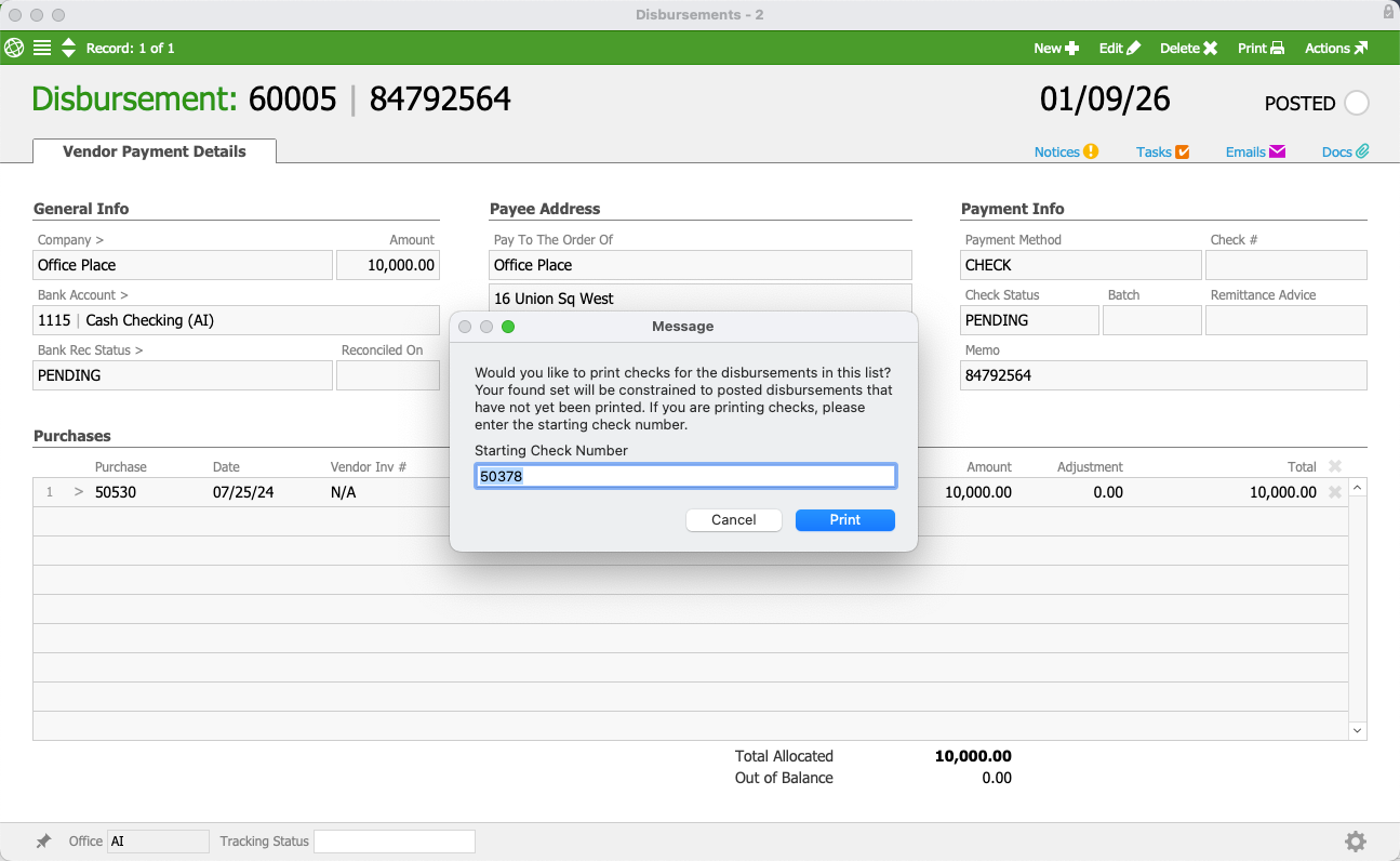 After printing the checks, aACE automatically updates the Check Status to Printed and notes the check number for each disbursement item.