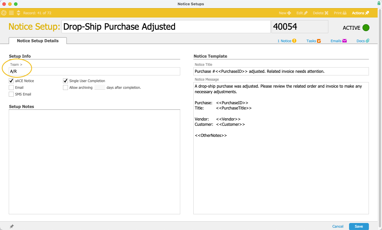 If your team members are receiving too many system notices, you can adjust the teams that receive each notice. Your aACE system includes several default teams you can use. You can also create additional teams to assign to a notice setup.